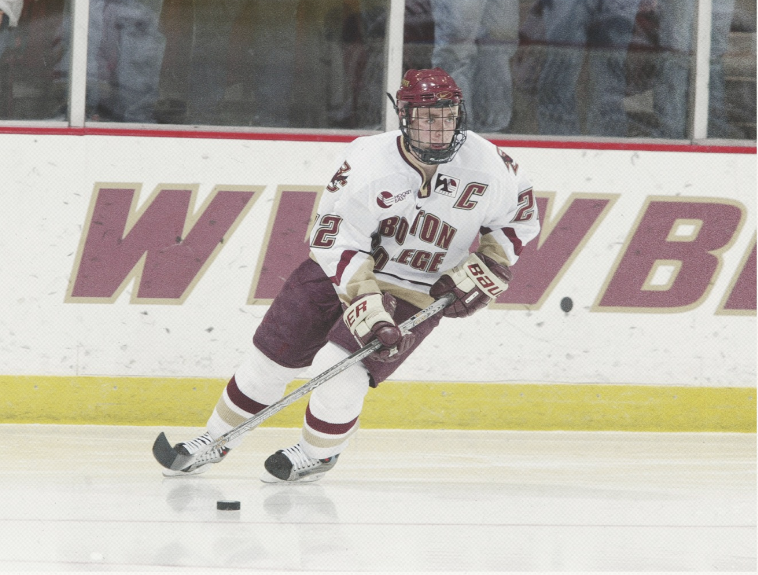 Ben Eaves was a dynamic forward for the Boston College Eagles from 2000 to 2004. In his junior season, 2002-2003, he had an outstanding year with 18 goals and 34 assists for 52 points, earning him a Top 10 nomination for the Hobey Baker Award. That same year, he was also named a First-Team All-American, a member of the Hockey East First Team, and the Hockey East Player of the Year. A member of a decorated Boston College team, he helped lead the Eagles to a 2001 NCAA Championship as a freshman.