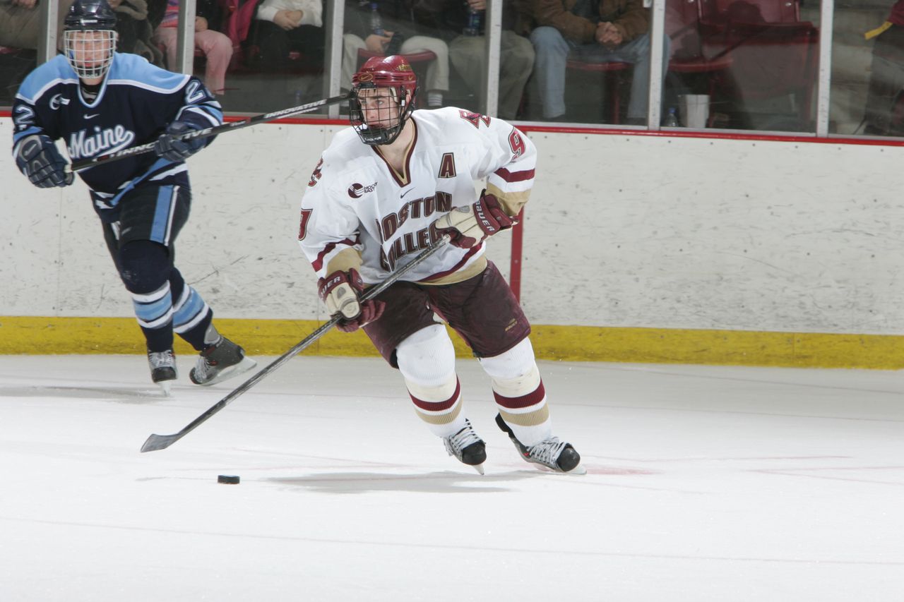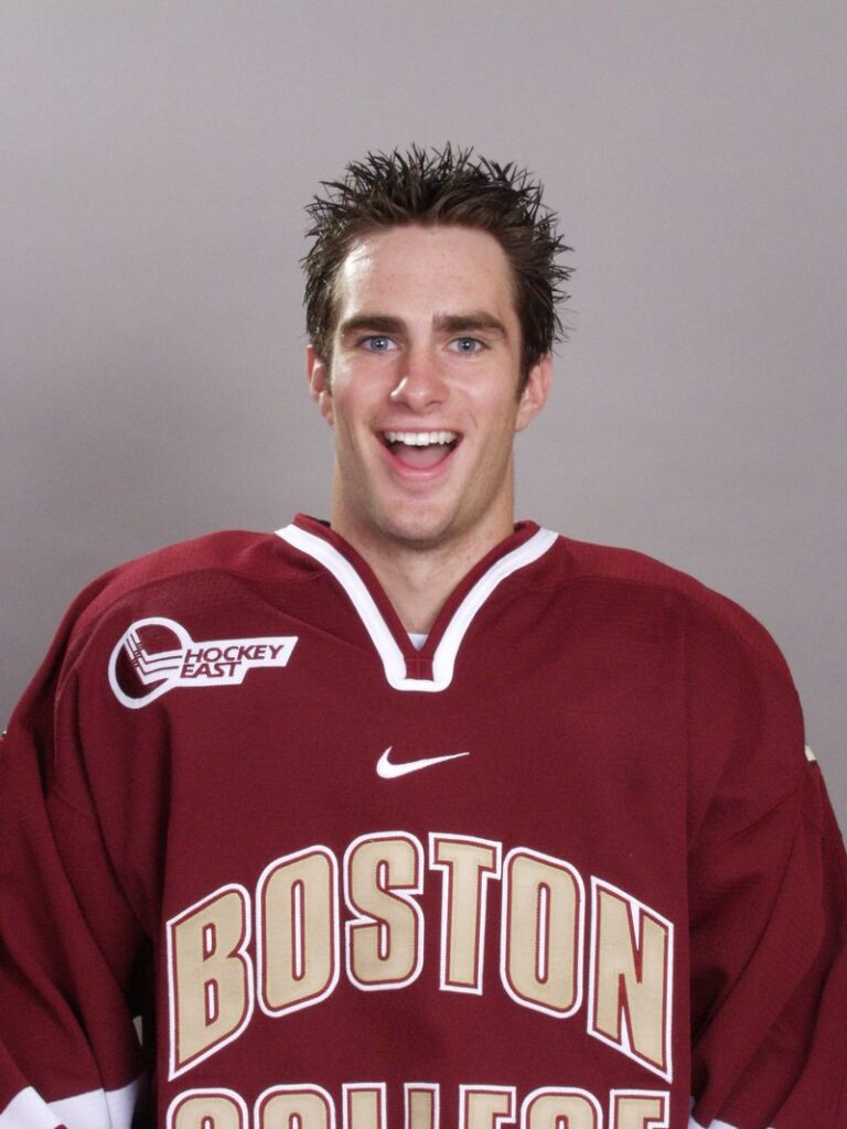 Patrick Eaves was a dominant forward for the Boston College Eagles from 2002 to 2005. He had a standout junior year in 2004-2005, where he was a Top 10 finalist for the Hobey Baker Award. That season, Eaves led his team with 48 points on 19 goals and 29 assists and was named the Hockey East Player of the Year and an AHCA First-Team All-American. He also helped lead the Eagles to a Hockey East regular season and tournament championship.