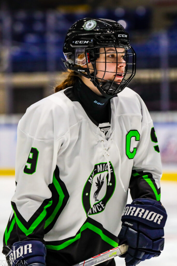 Navaeh Schloegl quit playing hockey after the 2020-2021 season. She was burned out and did not want to play anymore, until she found the Greater Saginaw Amateur Hockey Association’s new high school girls team! The Mid-Michigan Alliance Valkyrie had just started as an affiliate in the Michigan Girls High School Hockey League. Navaeh, at that point was missing playing the game and decided to give it another shot. Navaeh quickly found a place among the girls on the team and quickly became one of the best high school players of all the teams, boys and girls, that participate in the GSAHA high school varsity division. Navaeh has since gone on to captain the MMA team and is one of the top players in the Michigan Girls High School Hockey League.